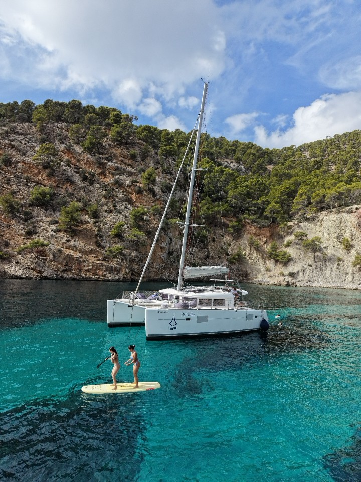 Our 4.5-hour catamaran excursion begins in the beautiful bay of Santa Ponsa, known for its crystal-clear waters and preserved natural environment. You will sail along Mallorca’s picturesque coastline, between cliffs, hidden coves, and paradise beaches. A swimming stop is planned in turquoise waters, where you can fully enjoy the experience thanks to our equipment: paddle boards, snorkeling gear, and inflatable toys.